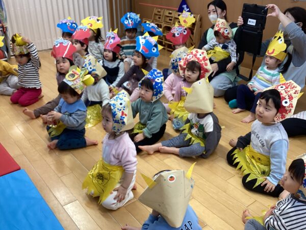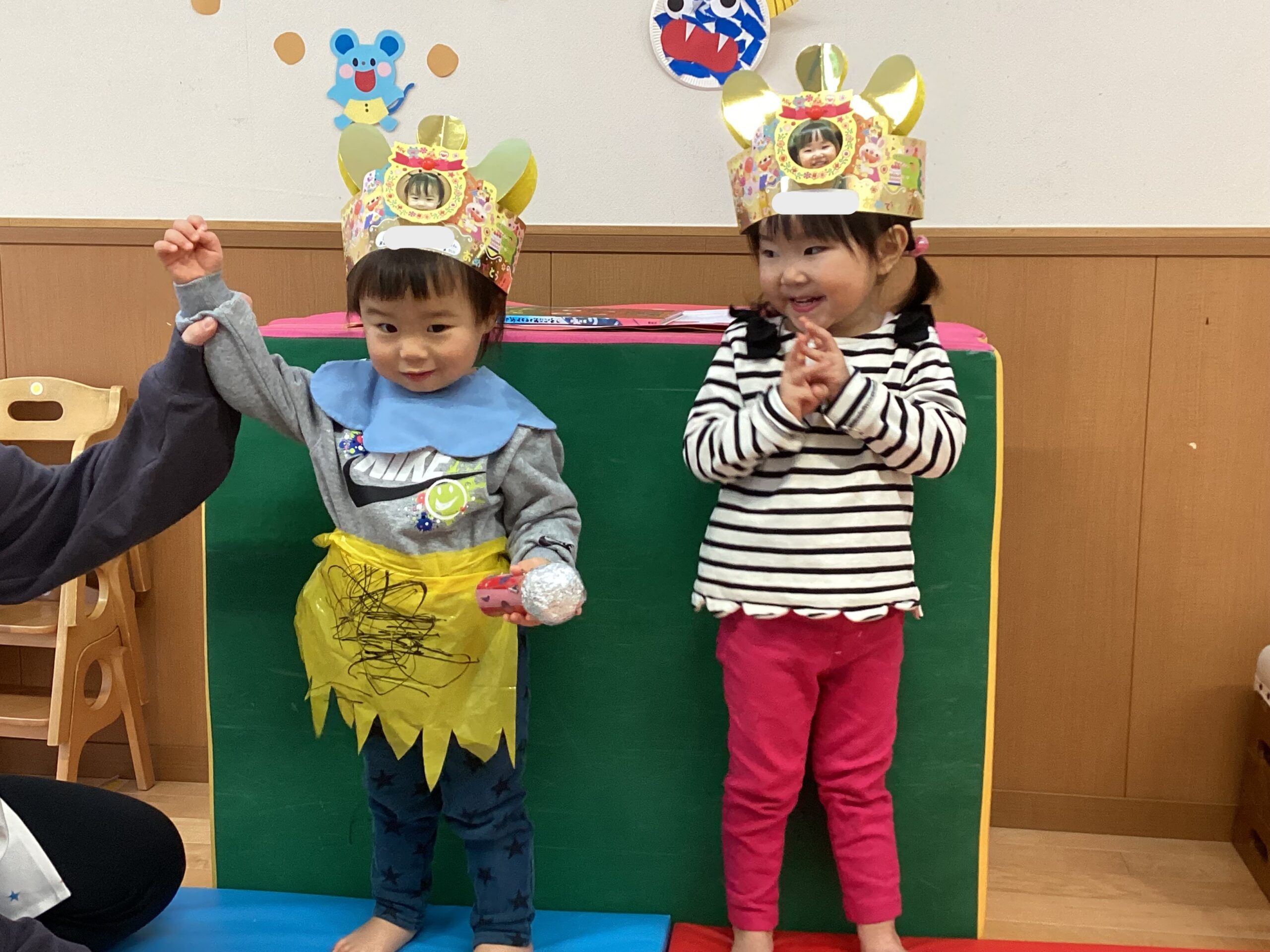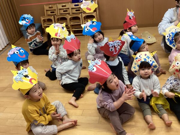 ひよこ組もうさぎ組も,それぞれ鬼の帽子を作って参加しました。