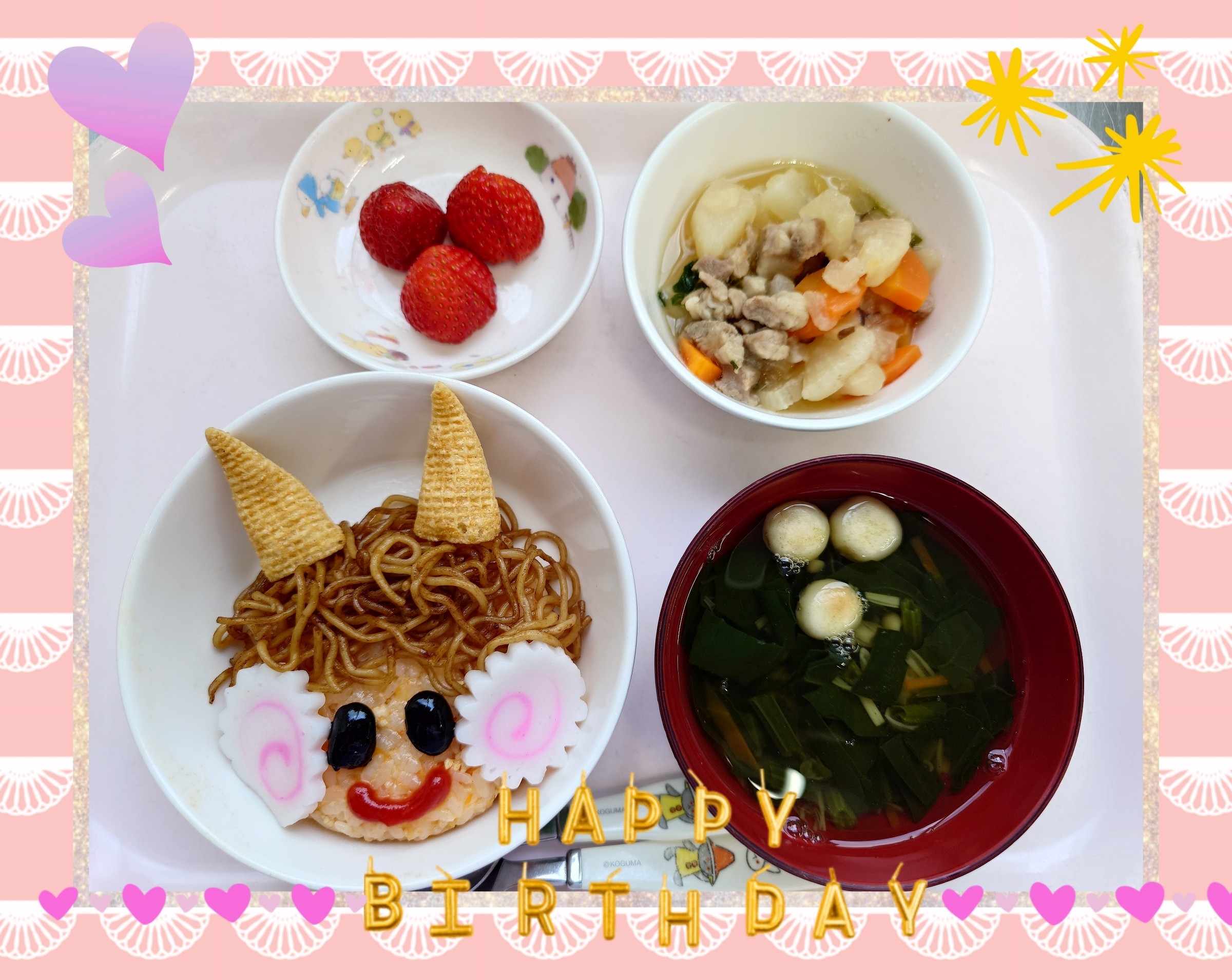 2月の誕生会特別メニューは,おにっこライス,大根の中華風煮物,すまし汁,いちごでした。
