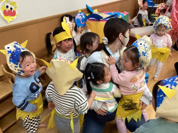 突然の事態にびっくり涙が出てしまう誕生会となりましたが,鬼がいなくなると安心した様子を見せていました。