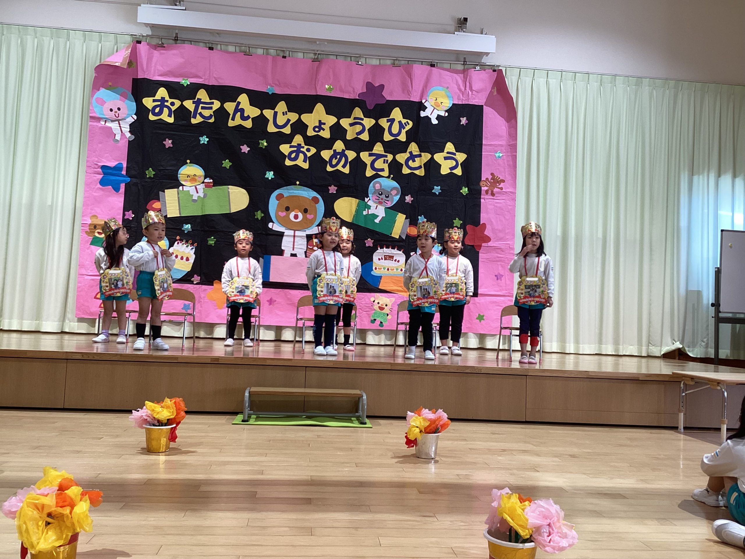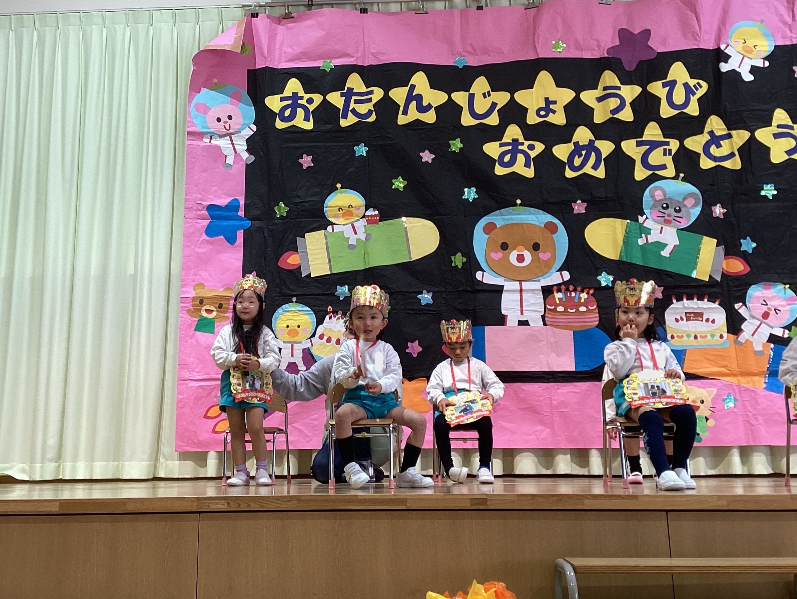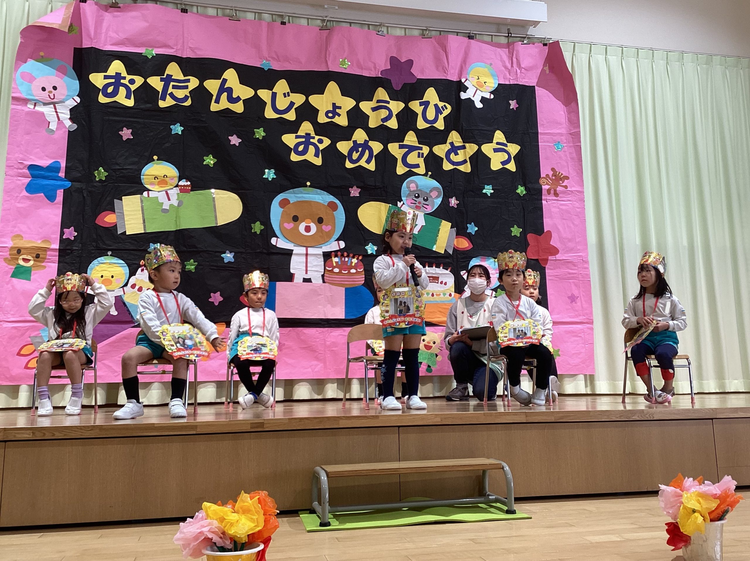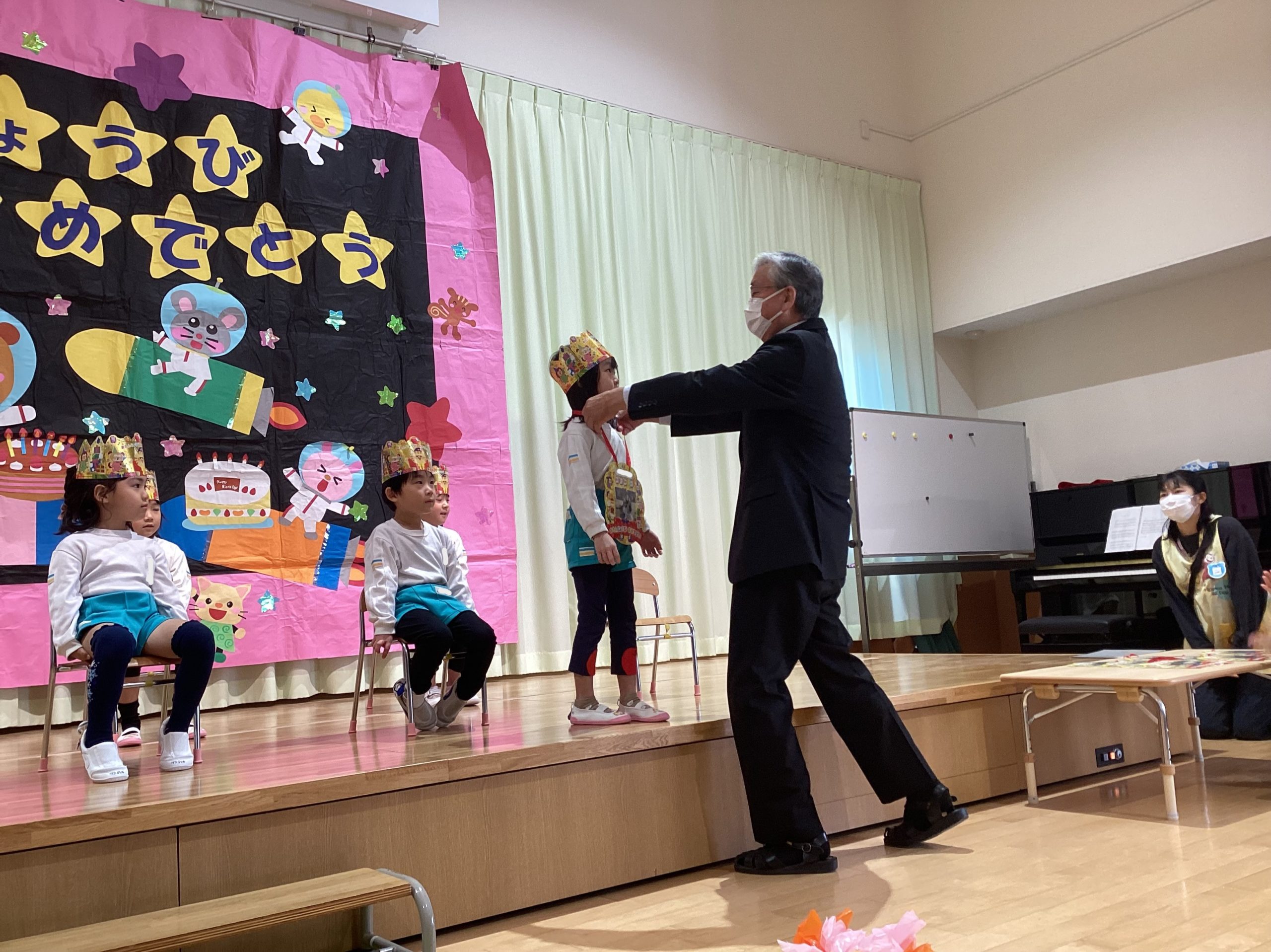 写真の背景は子どもたちが作った作品です。