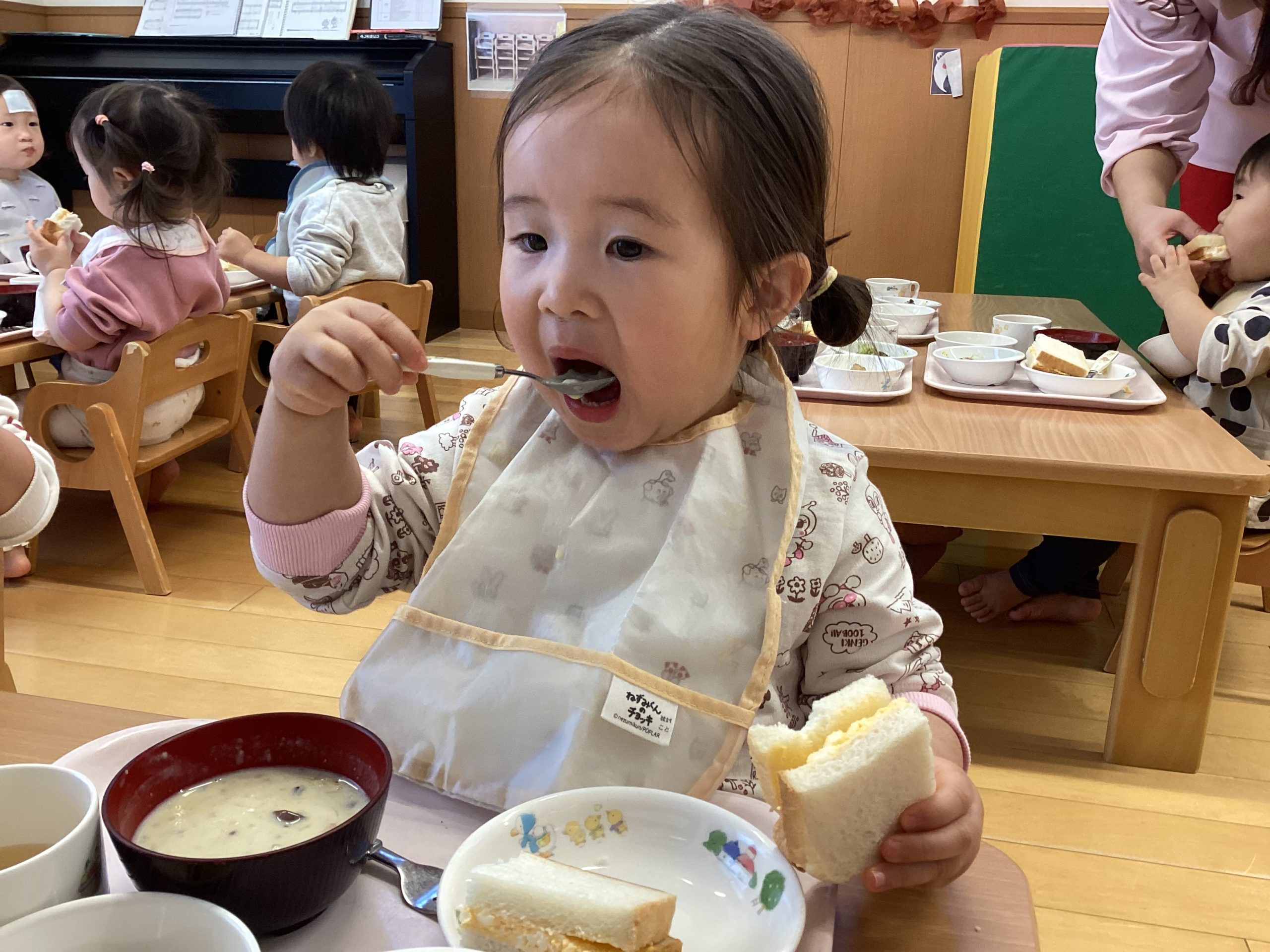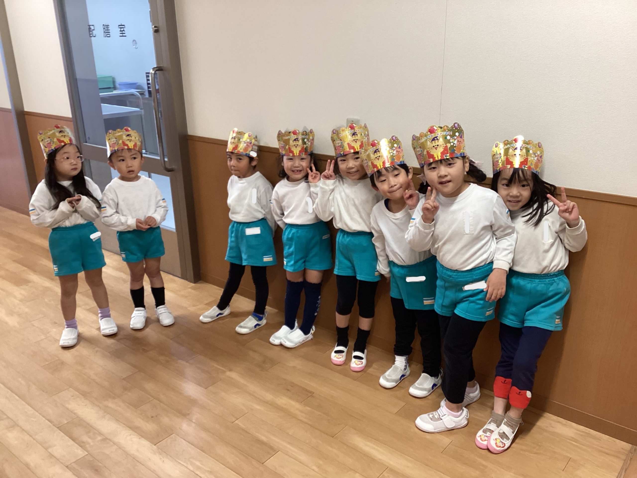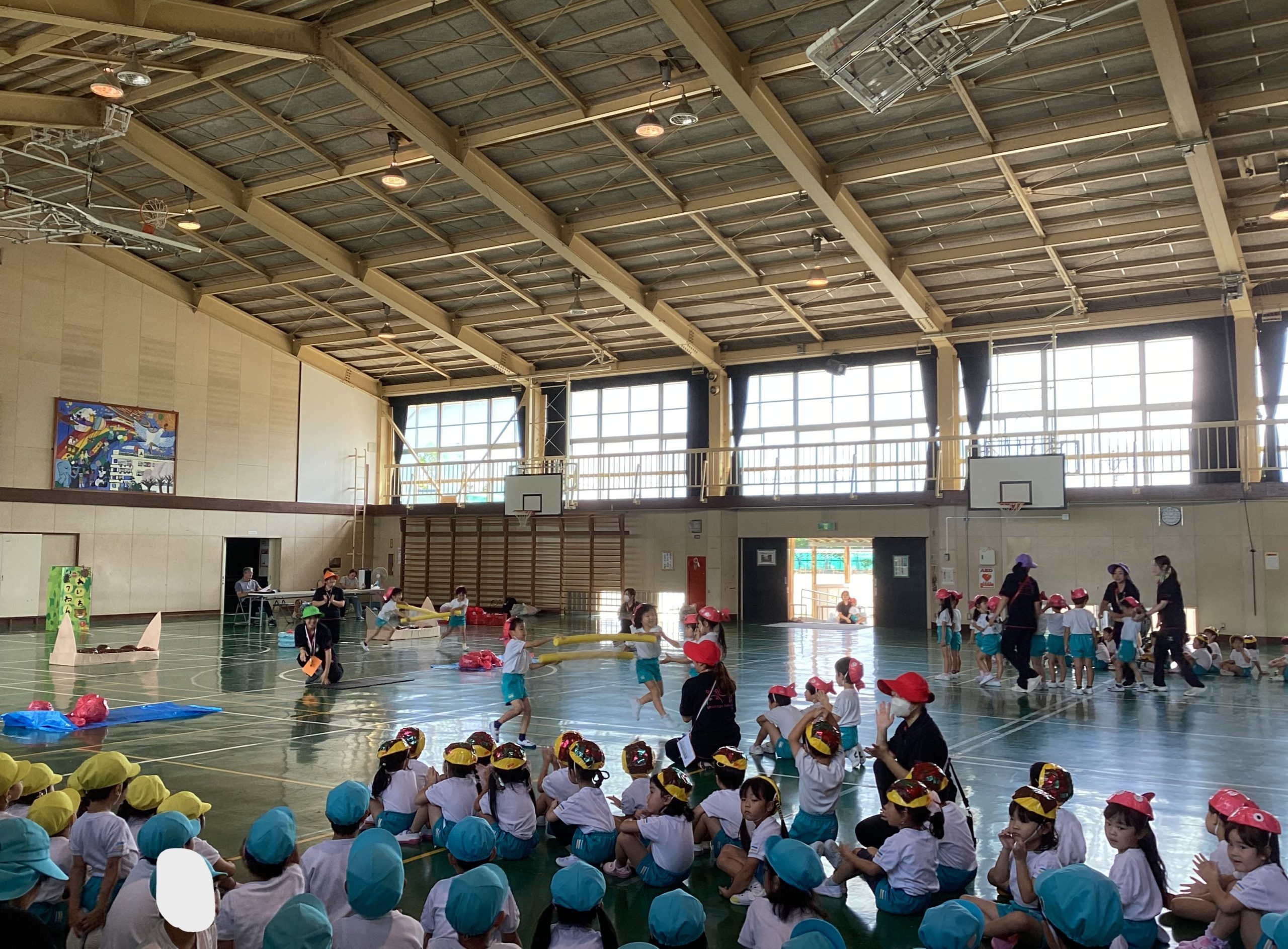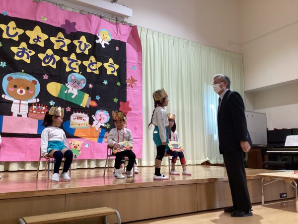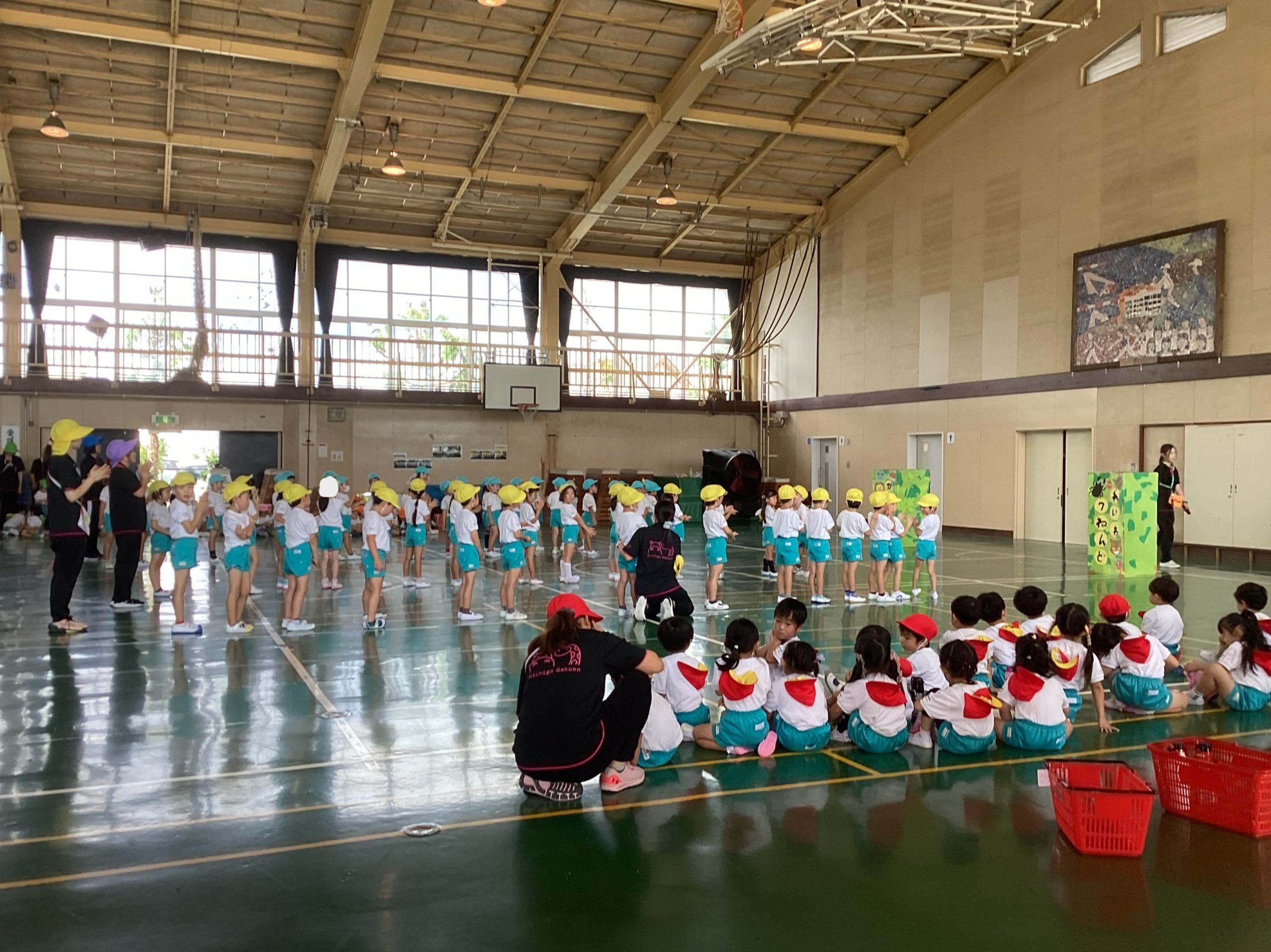 写真の背景は子どもたちが作った作品です。