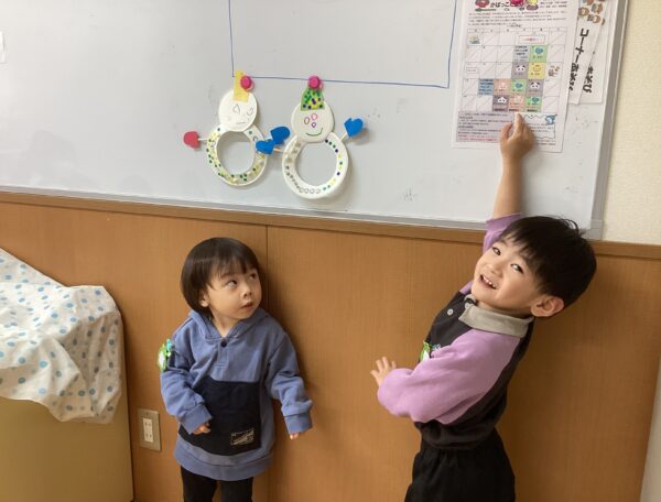 自分たちの雪だるまをホワイトボードに飾ると,嬉しそうに教えてくれました。