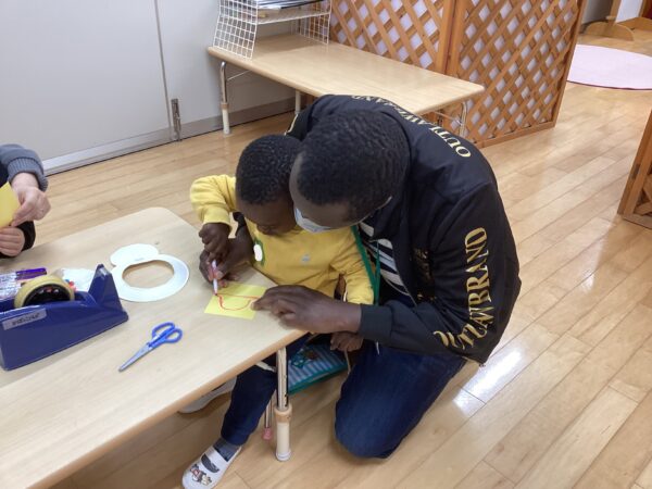 「黄色の鬼にする」「ここにも折り紙貼ってみようか」