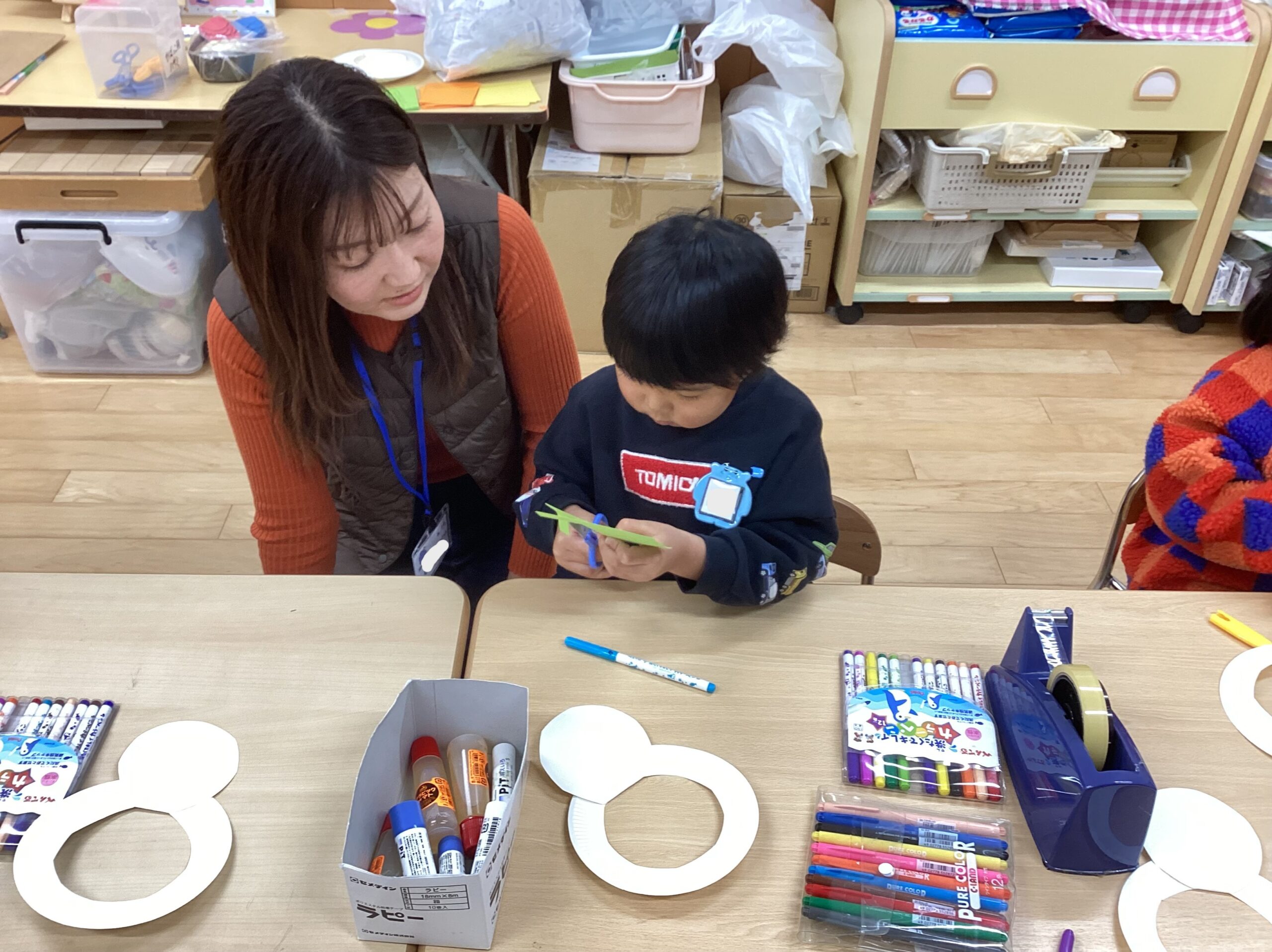 「黄色の鬼にする」「ここにも折り紙貼ってみようか」