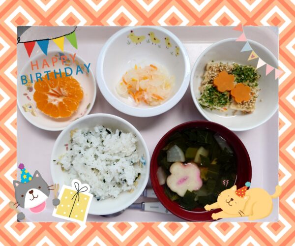1月の誕生会特別メニューは,わかめごはん,松風焼き,紅白なます,小松菜のすまし汁,みかんでした。