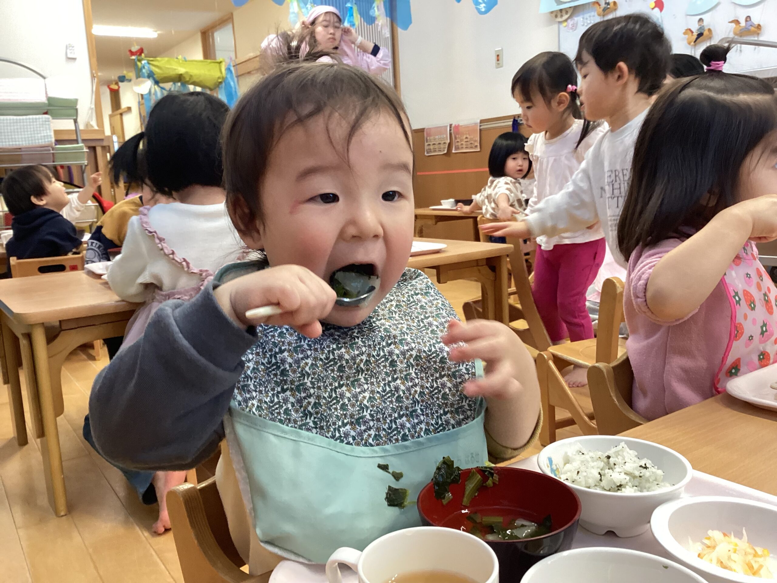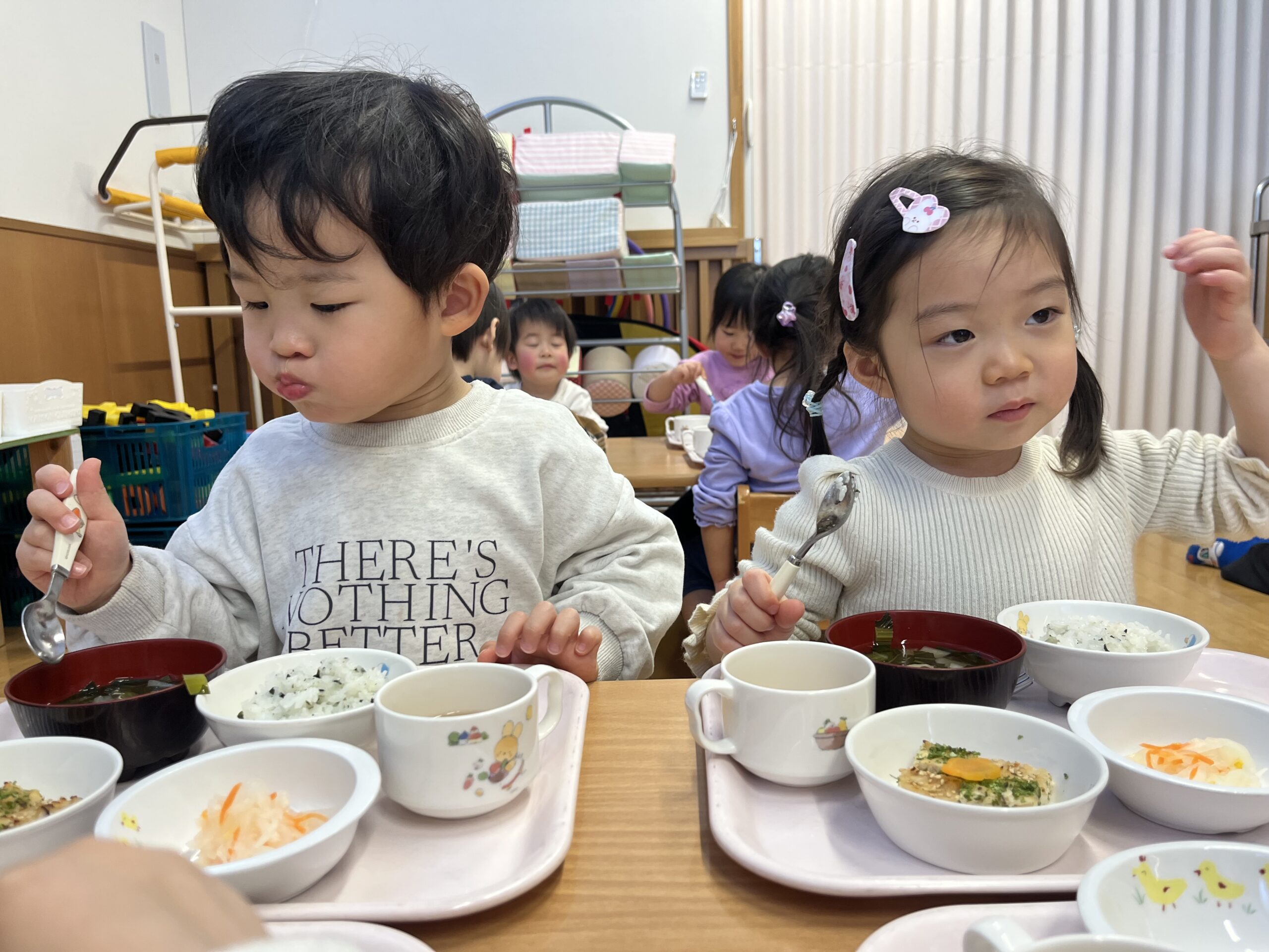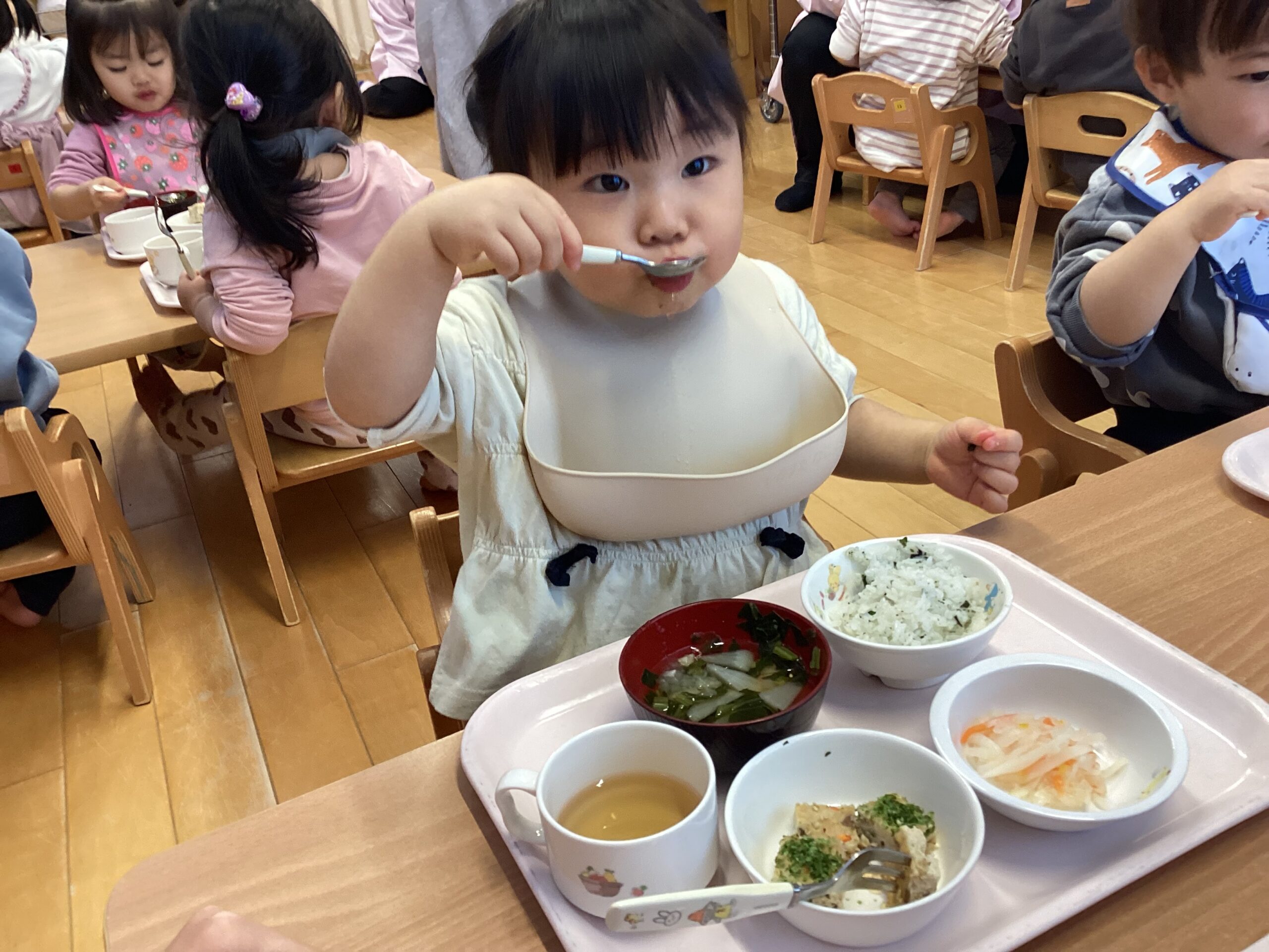スプーンやフォークを使い,おいしそうに食べていました。
